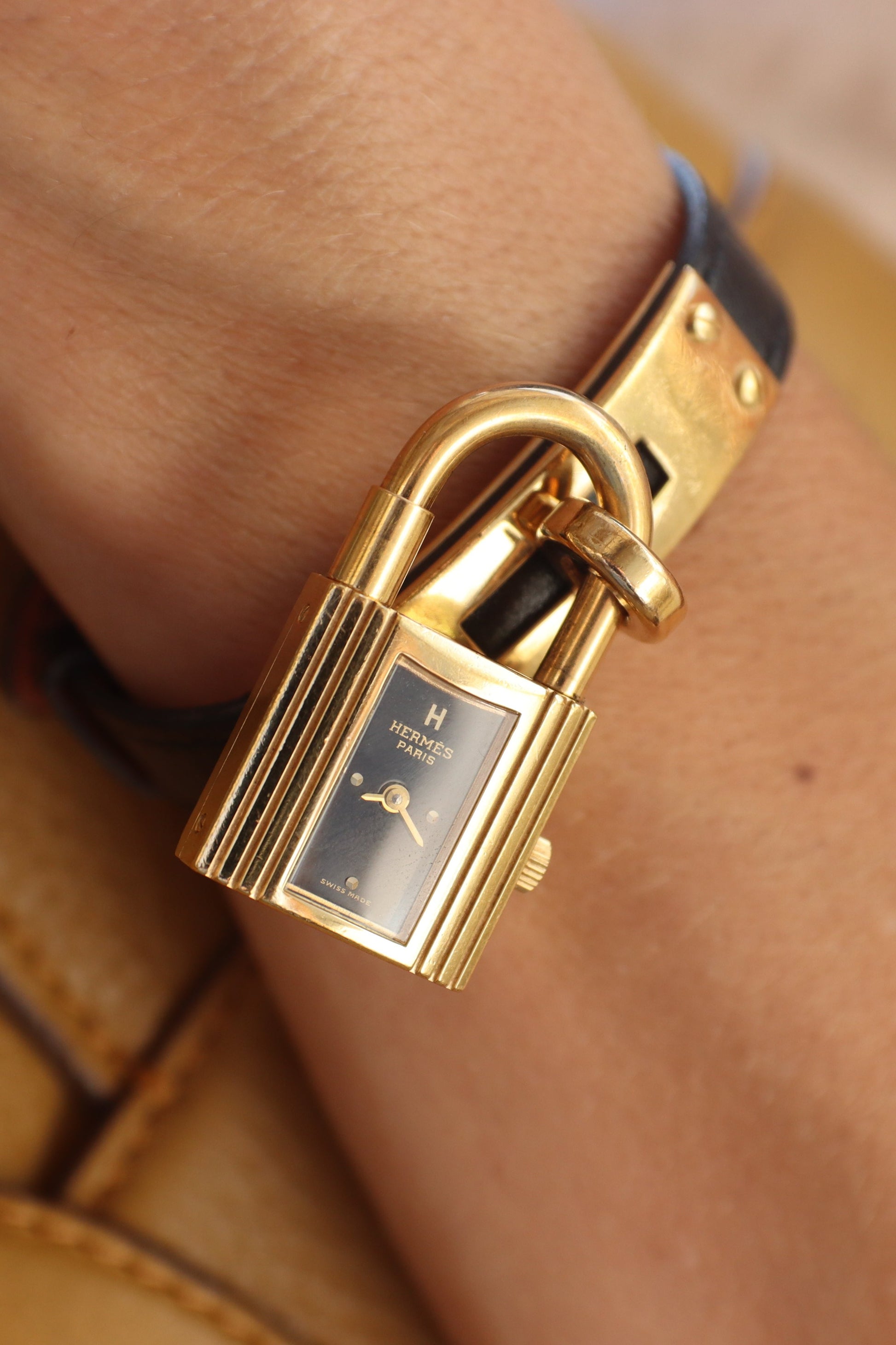 Comment: This Hermès Kelly Cadenas watch features a distinctive square design with a gold-plated padlock dial and a sleek leather strap, available in black or white.